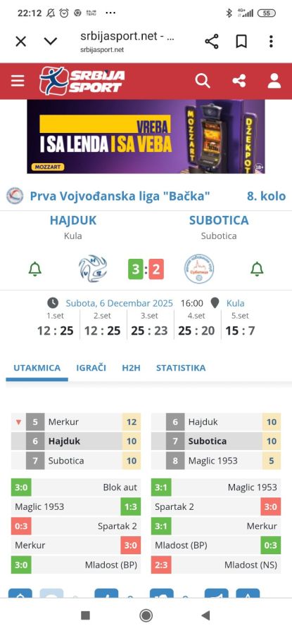 8. decembar 2025.Резултат: 3:2 (12:25, 12:25, 25:23, 25:20, 15:7)